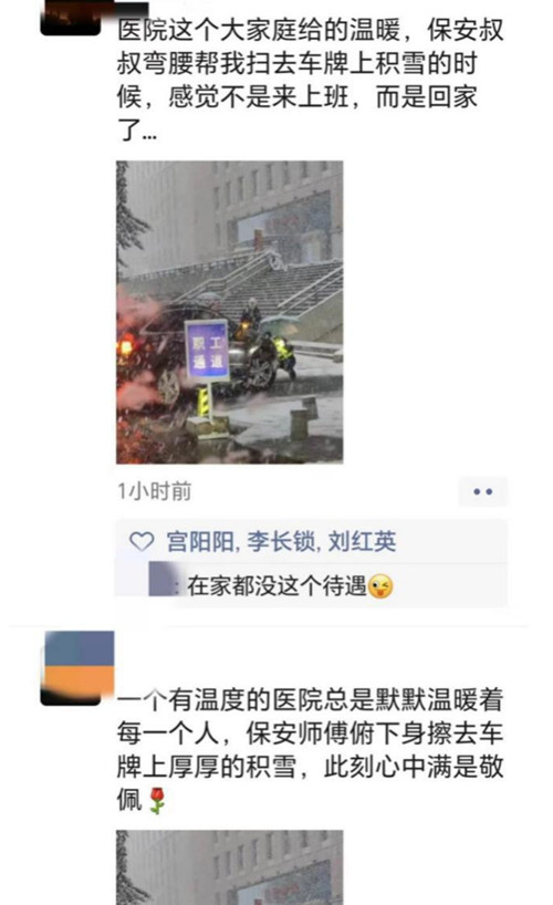 職工車輛進入醫(yī)院地下停車場需要識別車牌,而積雪覆蓋了車身將車牌擋的嚴嚴實實,造成系統(tǒng)無法識別,車輛入口處擁堵加劇。朝陽分公司保安員張利輝見狀,就主動俯身幫助入場車輛掃去車牌上的積雪,一次次俯身,一次次起立……反復的動作中我們看不清他的樣貌,卻始終有那么一個身影在不停的揮舞著掃把為車輛掃去積雪,保證車輛有序快速入場。這一行動溫暖了廣大員工的心,大家紛紛在微信朋友圈為他點贊。